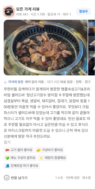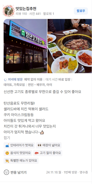 밤에는 가족, 친구, 동료와 함께 푸짐한 고기 무한리필을 즐겨보세요!