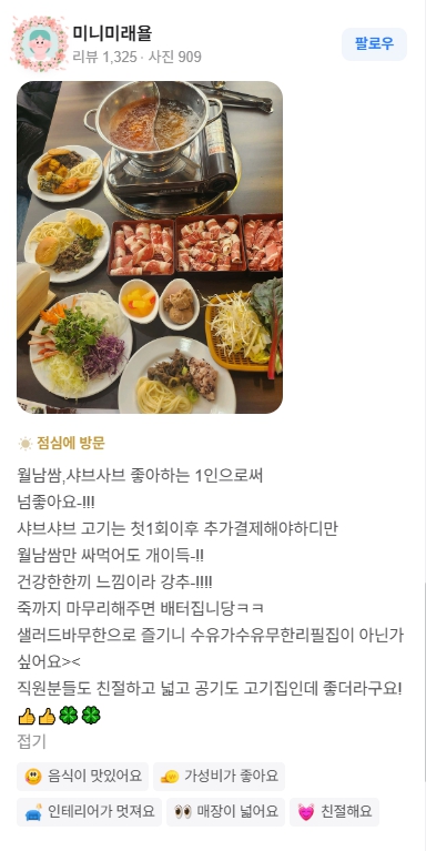 낮에는 깔끔한 샤브샤브와 월남쌈, 샐러드바로 든든하게 점심 해결!
